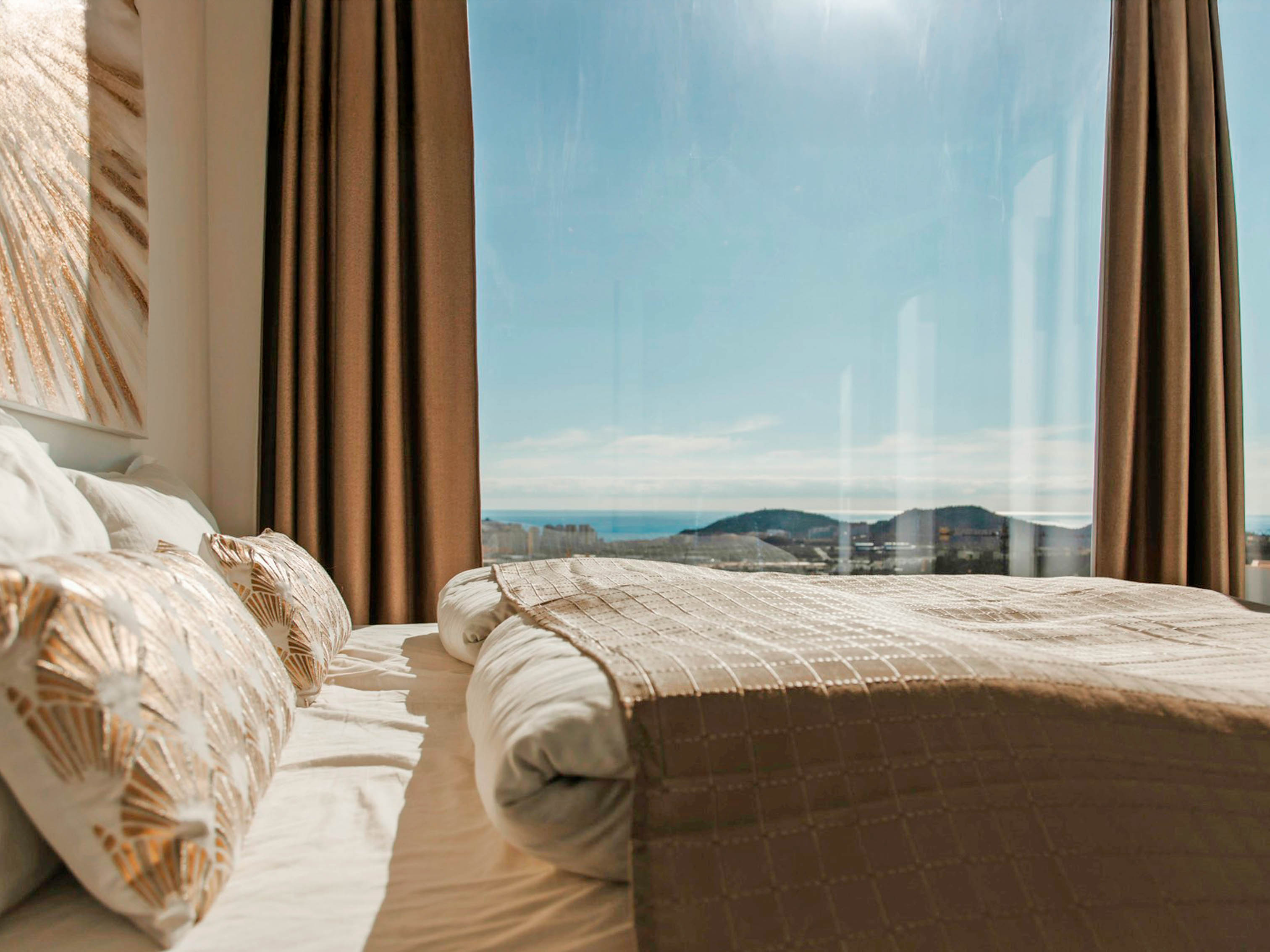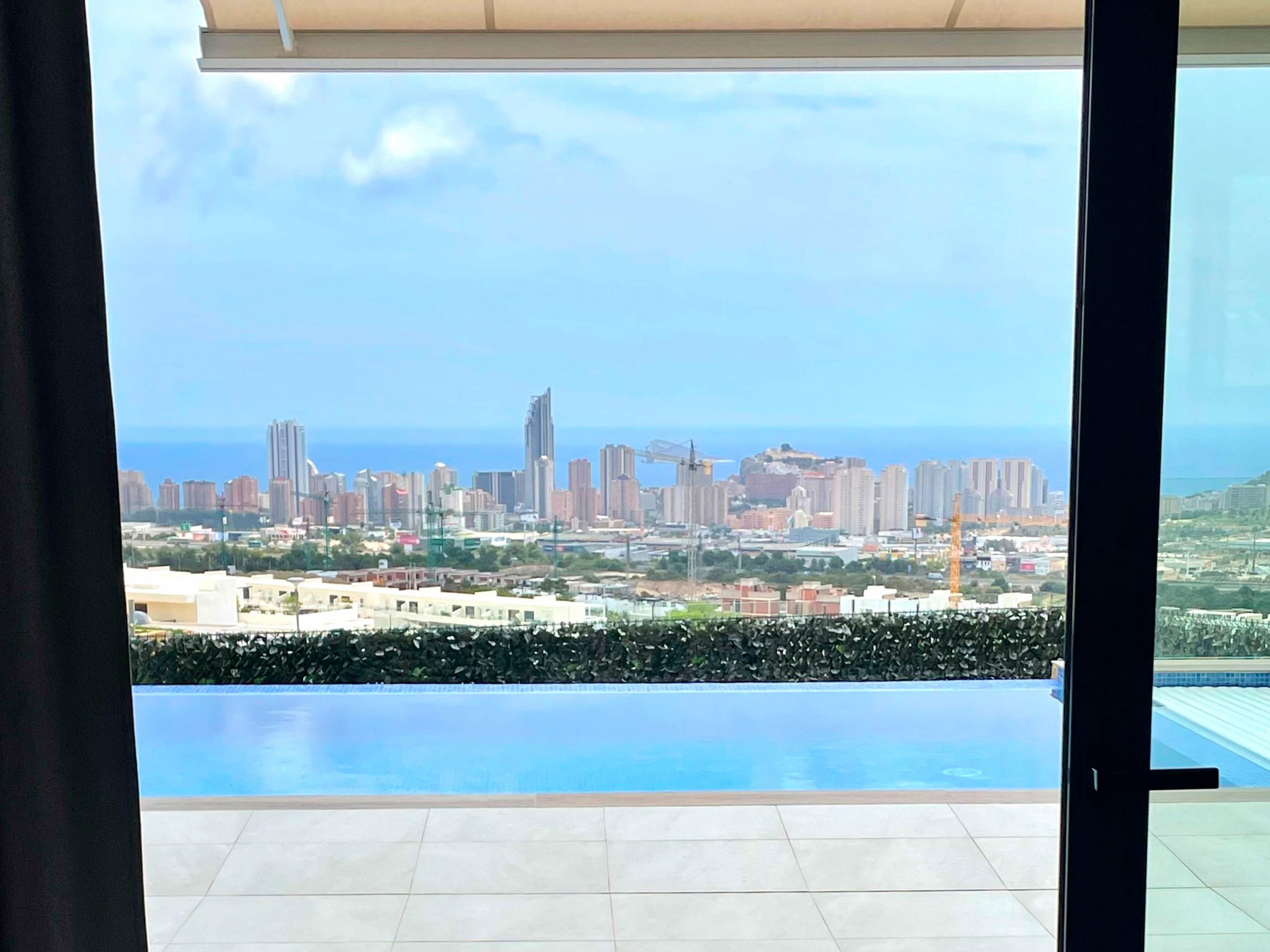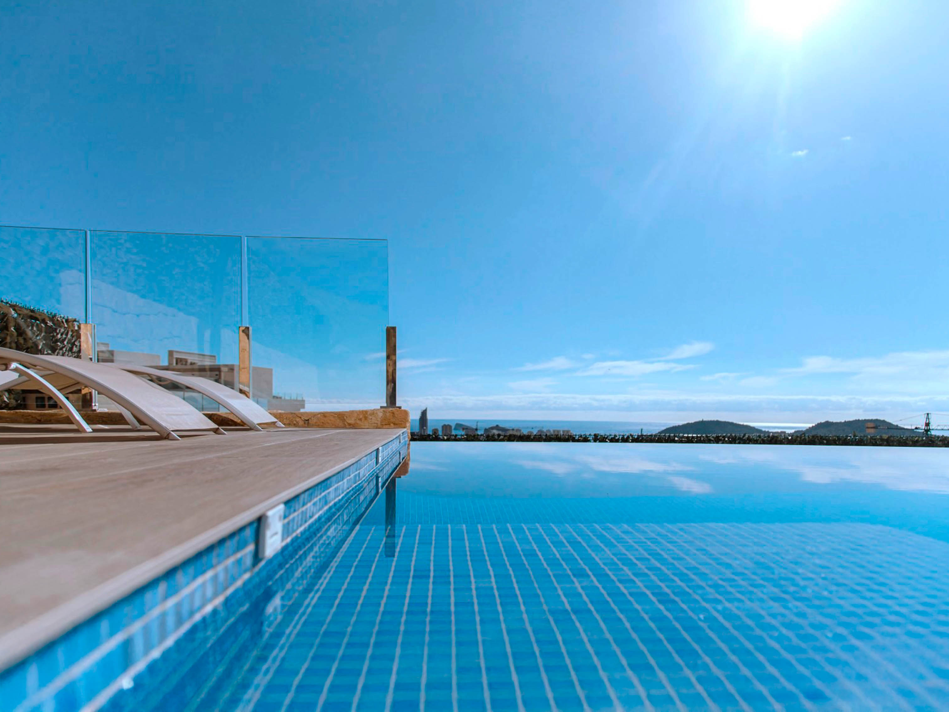 The top floor hosts 3 double bedrooms with private terraces overlooking the skyline of Benidorm, and 3 bathrooms (two of them are ensuite). Descend to the second level to be captivated by the stunning views and discover the main living area with a living room, a dining room, and a modern fully equipped kitchen with a breakfast bar. Step outside to the terrace on this level to indulge in a refreshing swim in the infinity pool while soaking in the mesmerizing sea views or prepare a BBQ for a nice dinner on the terrace with friends or family. This level also features a separate toilet room and another double bedroom with an ensuite for added convenience. Journey down to the third level to find another bathroom, a laundry, and a small gym with everything necessary to keep you in shape daily. From this level you can access the garden and go up to the pool and sun lounge area. Enjoy a touch of luxury and modern comforts throughout the villa with air conditioning, high-speed wi-fi, and a property alarm system for added security. Parking is a breeze with space for up to two vehicles on the private driveway. This idyllic location strikes the perfect balance by offering a serene daytime retreat and yet is located less than 10 minutes’ drive to Benidorm's vibrant nightlife.